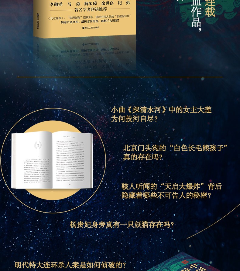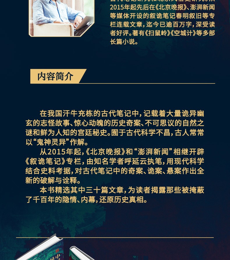 本書由《北京晚報》和澎湃新聞共同開闢專欄的內容結集而成。本書在對古代筆記小說及其背景史料做大量閱讀和全面把握的基礎上,摘取其中的志怪故事、歷史奇案、自然之謎和宮廷秘史等相關記載40餘則,按照現代科學或最新的史學研究成果進行整理、歸納,作出合理的分析和解釋。全書選材別具特色,論說有理有據,從生動活潑的文字中體現了作者嚴謹的科學素養和紮實的研究精神。本書分成四個類別:一、志怪傳奇;二、歷史奇案;三、自然之謎;四、宮廷秘史。