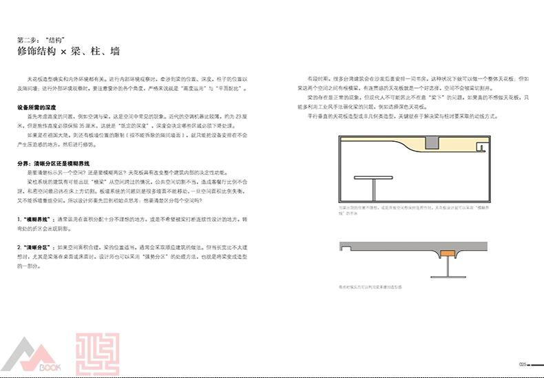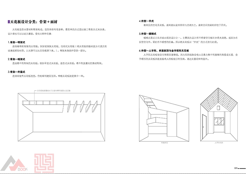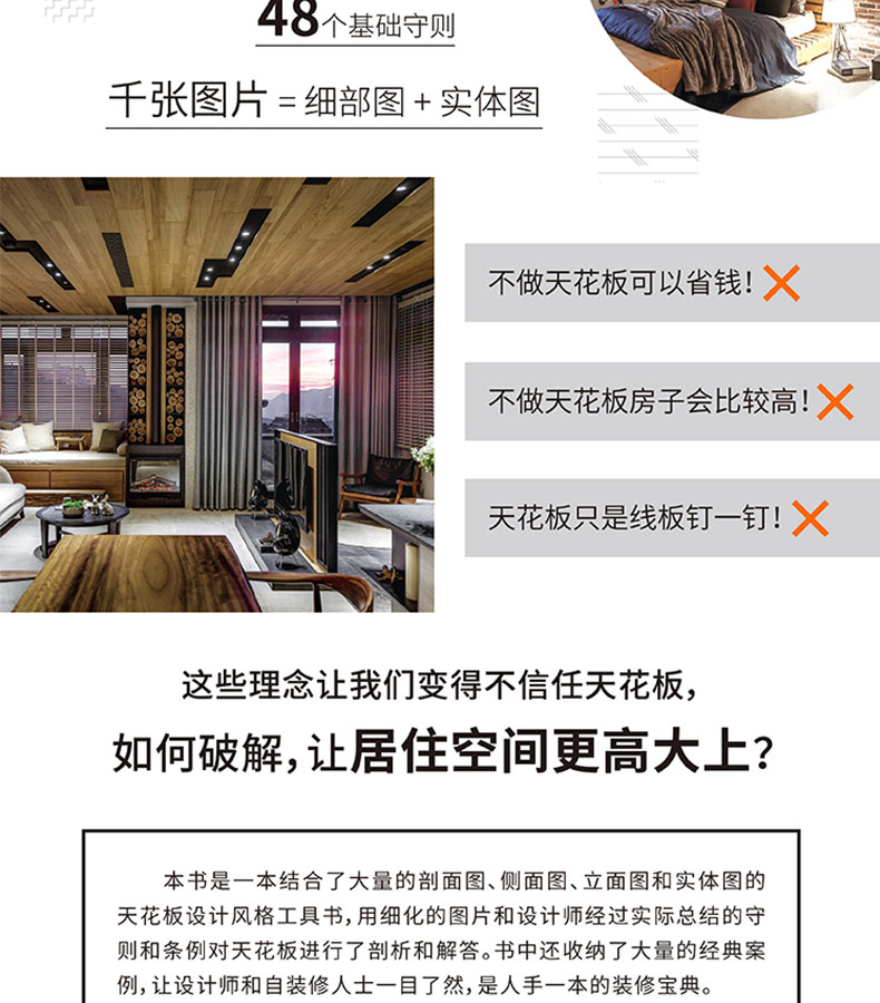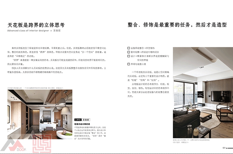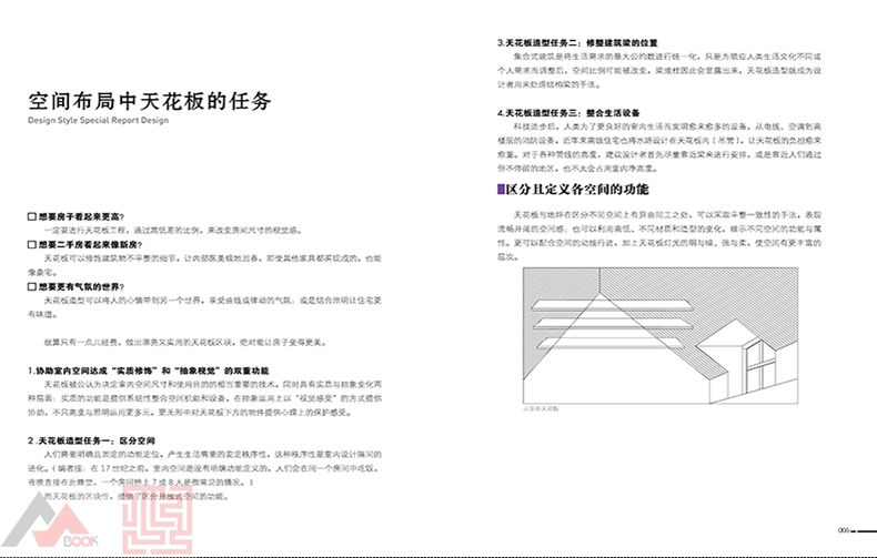 這是一本結合了大量的剖面圖、側面圖、立面圖 和實體圖的天花板設計風格工具書,用細化的圖片和 設計師經過實際總結的守則和條例對天花板進行了剖 析和解答。書中還收納了大量的經典案例,讓設計師 和自裝修人士一目了然,是人手一本的裝修寶典。