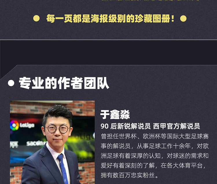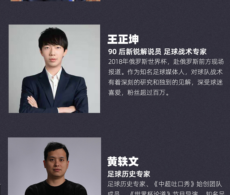於鑫淼,著名足球解說員,曾擔任世界盃、歐洲杯等國際大型足球賽事的解說員,並解說歐洲冠軍聯賽、歐洲五大聯賽、世俱杯等多項足球賽事,其解說風格深受球迷歡迎。從事足球工作十餘年,他對歐洲足球有著深厚的認知,對球迷的需求和愛好有著深刻的了解。在各大體育平台擁有數百萬忠實粉絲。