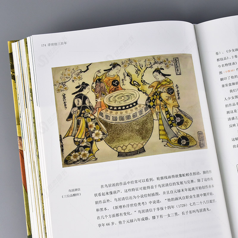 《浮世繪三百年》是日本有名美術史家大村西崖(1867-1927)和明治時代有名編輯田島志一(1868-1924)於明治三十九年(1906)共同編著的一本浮世繪作品精選集,全書分為18個章節,講述了日本室町時代末期到明治中晚期約三百多年的繪畫史,聚焦於浮世繪流派的萌芽、誕生、發展和興盛的全過程,按照時間順序,分章節敘述了菱川派、宮川派、勝川派、懷月堂派、鳥居派、鳥山派、北尾派、歌川派、葛飾派等近二十個分支流派的發展情況,每派舉出數名代表人物及其代表畫作,同時梳理各流派的家族歷史和紛繁複雜的師承關係,對日本文化歷史和繪畫史做了很好全面的介紹,是了解日本浮世繪的推薦藏品。