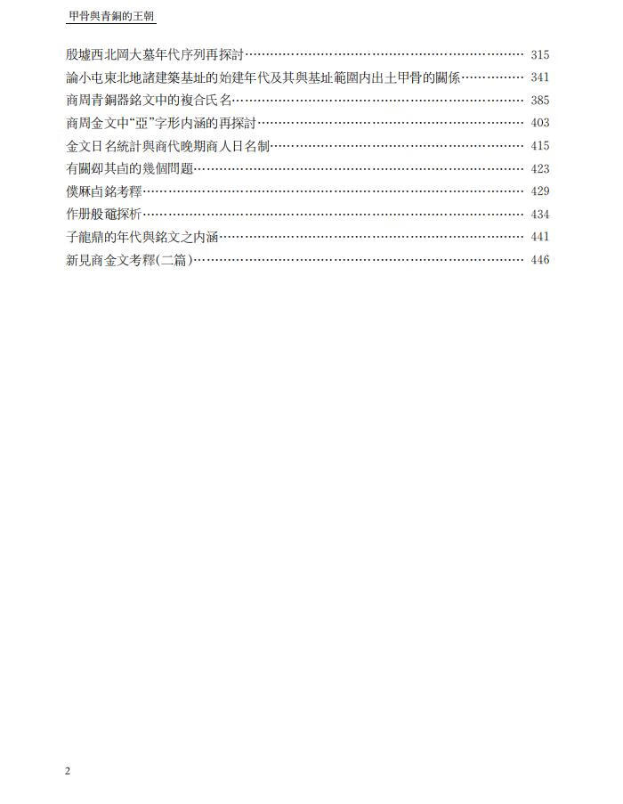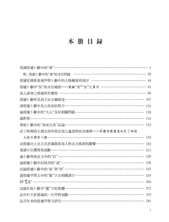 本書分三冊。上冊為商代部分,收錄了《再讀殷墟卜辭中的“眾”》等論文30篇(另附文1篇),中冊為西周部分,收錄《〈召誥〉、〈洛誥〉、何尊與成周》等39篇論文(另附文1篇),這些文章綜合運用了歷史學、古文字學、考古學等學科的理論與方法,著重探討了商和西周時期的社會結構、政治制度、家族形態、宗教觀念、政治地理等方面的重要學術問題。下冊包括東周及通論兩部分,共收錄17篇文章,另有1篇訪談文章,東周部分主要論及這一歷史階段社會階層與社會組織的狀況,通論部分的文章則較宏觀地論述了商周社會結構、宗教觀念的演變等問題,也有對中國考古學與歷史學的關係等方法論的思考,其中也涉及到對夏文化考古學探討的看法。
