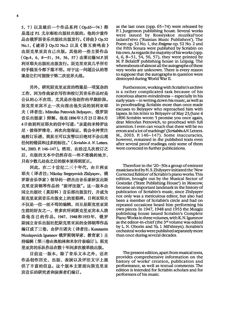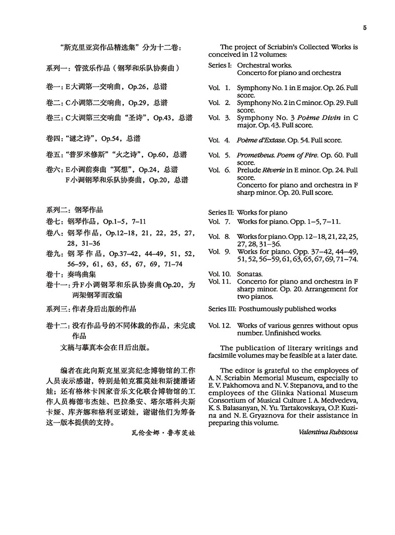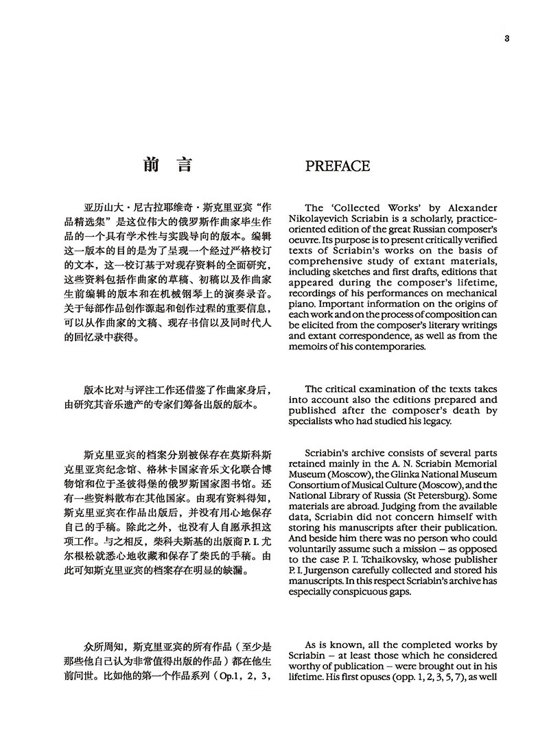 亞曆山大·尼古拉耶維奇·斯克裏亞賓“作品精選集”是這位偉大的俄羅斯作曲家畢生作品的一個具有學術性與實踐導向的版本。 編輯這一版本的目的是為了呈現一個經過嚴格校訂的文字,這一校訂基於對現存資料的全面研究,這些資料包括作曲家的草稿、初稿以及作曲家生前編輯的版本和在機械鋼琴上的演奏錄音。 關於每部作品創作源起和創作過程的重要資訊,可以從作曲家的文稿、現存書信以及同時代人的回憶錄中獲得。