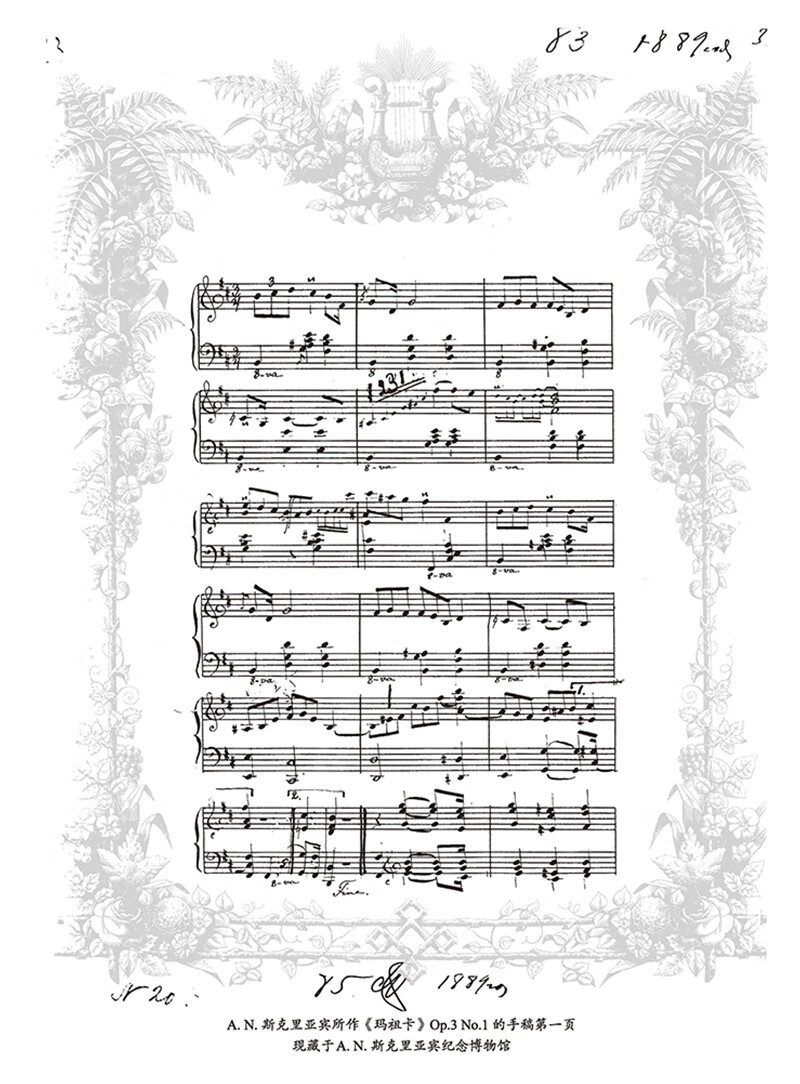 亞曆山大·尼古拉耶維奇·斯克裏亞賓(Alexander Nikolayevitch Scriabin,1871-1915)俄國作曲家、鋼琴家,是一比特交響樂作曲家和鋼琴音樂的大師,畢業於莫斯科音樂學院。 早期作品以新的管道繼承了俄羅斯古典傳統。 他的作品充滿了尖銳的戲劇性和英雄氣概及樂觀向上的剛毅精神,旋律寬廣,情感激昂,結構宏偉而精緻,愛用龐大的管弦樂編制,音響既渾厚而又細膩,力度對比强烈。 其早期鋼琴作品,廣泛地運用了鋼琴的技巧和表現力,音樂形象鮮明,充滿熱情,緊張的節奏與尖硬的和聲時常出現,他大量運用複雜和絃,強調和聲的緊張度和不協和,表現作家內心感受到的尖銳的、不可緩解的衝突。