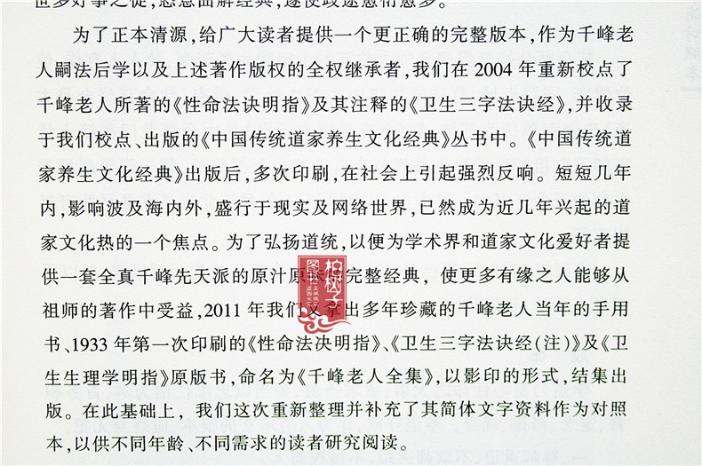 新編的《千峰養生集萃》除保留了千峰老人所著《性命法訣明指》《三字法訣經注》,增補了千峰老人另一部著作《衛生生理學明指》、劉名瑞祖師著《道源精微歌》《敲蹻洞章》《瀊熻易考》蔣救愚著《補修道全指》、李昌仁著《玄妙境》,另增補了《玄妙境》姊妹篇《玄關經》、養真子著《養真集》。