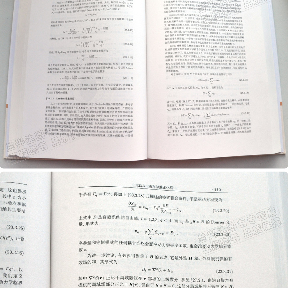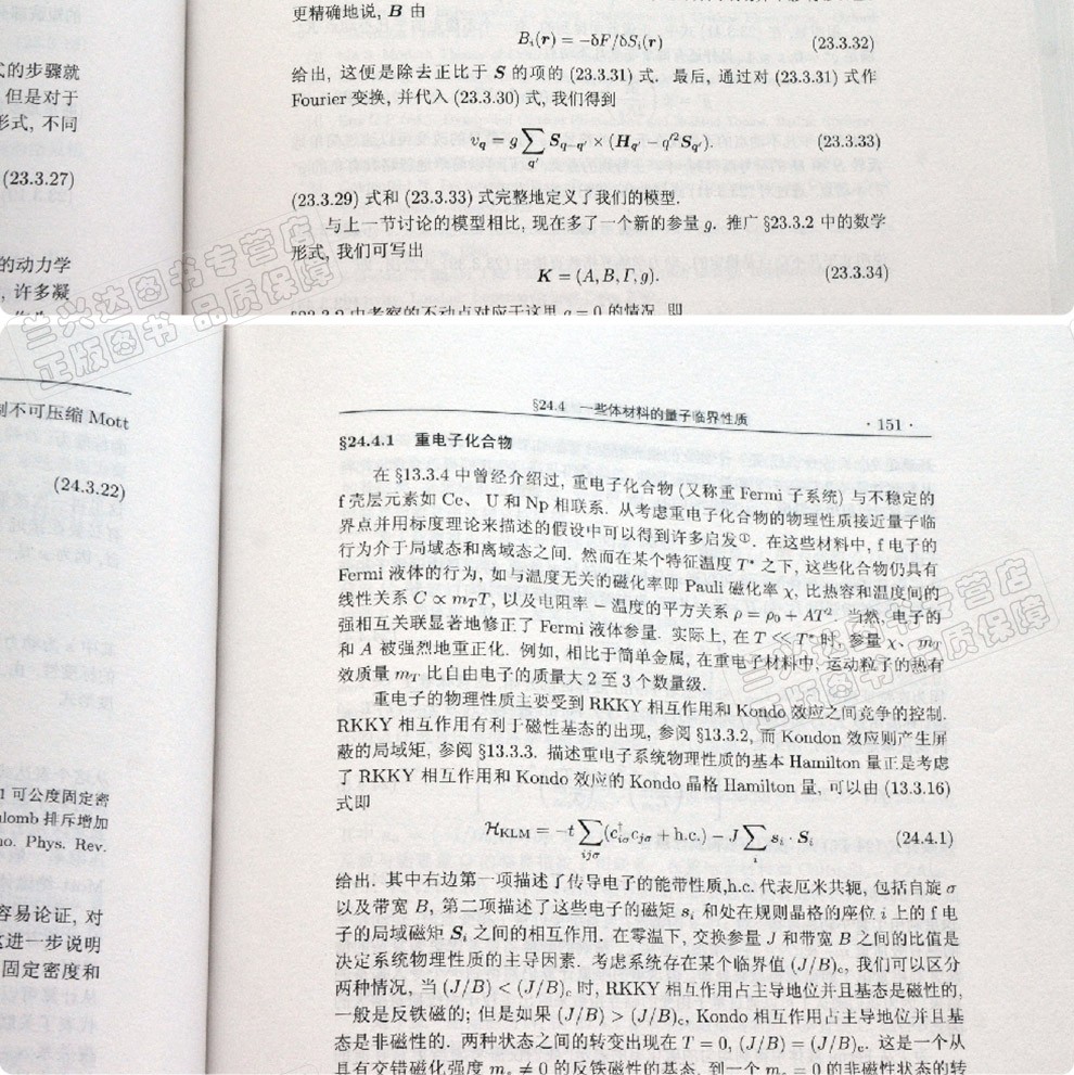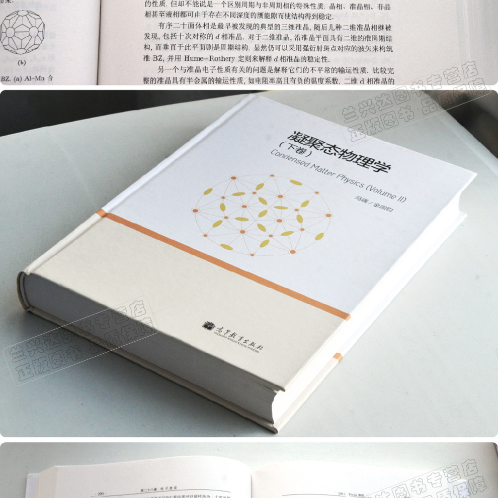 接上卷的前四編之後,下卷括後四編. 第五編為臨界現象,從分析漲落和關聯出發,論述了凝聚物質中由溫度、幾何參數、時間和熱物理量調控的各類臨界現象,強調了標度理論和重正化群方法; 第六編為元激發,首先給出了元激發的一般特徵、分類原則和場論描述,然後分別論述了與原子位移有關的振動激發,與自旋進動聯系的自旋激發,與電子相互作用關聯的電子激發,以及來自不同類型激發之間耦合的耦合型激發; 第七編為織構和拓撲缺陷,從廣義彈性和流體動力學出發,論述了晶體、液晶、鐵磁體和超導體中缺陷的拓撲和幾何性質,結構和能量學,力學和物理性質,以及有缺陷介入的相變; 第八編為超出平衡態,一方面在傳統的凝聚物質範圍內,探討了與成核、失穩分解和疇壁形成有關的相變動力學,以及從力學、幾何和能量角度分析了晶體生長和形貌學,另一方面考慮在遠離平衡區,從失穩走向混沌,直至湍流問題,以及強調凝聚態物理學基本概念的開拓潜力,表現出在地震、 生物等與複雜性有關的學科中的應用