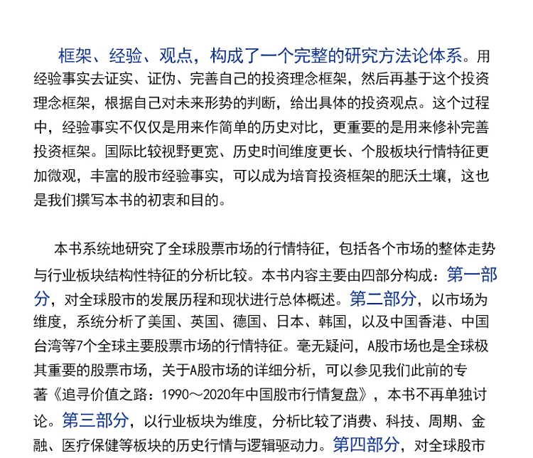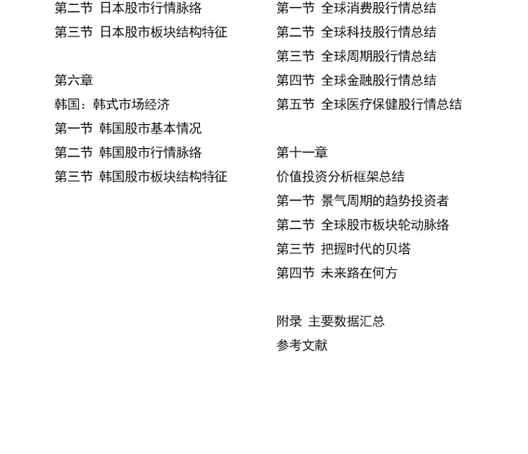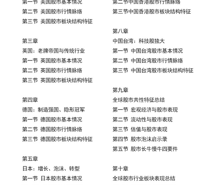 本書系統地研究了全球股票市場的行情特徵,包括各個市場的整體走勢與行業板塊結構性特徵的分析比較。本書內容主要由四部分構成:部分,對全球股市的發展歷程和現狀進行總體概述。第二部分,以市場為維度,系統分析了美國、英國、德國、日本、韓國,以及中國香港、中國台灣等7個全球主要股票市場的行情特徵。第三部分,以行業板塊為維度,分析比較了消費、科技、周期、金融、醫療保健等板塊的歷史行情與邏輯驅動力。第四部分,對全球股市行情的共性特徵和邏輯框架進行了歸納總結。