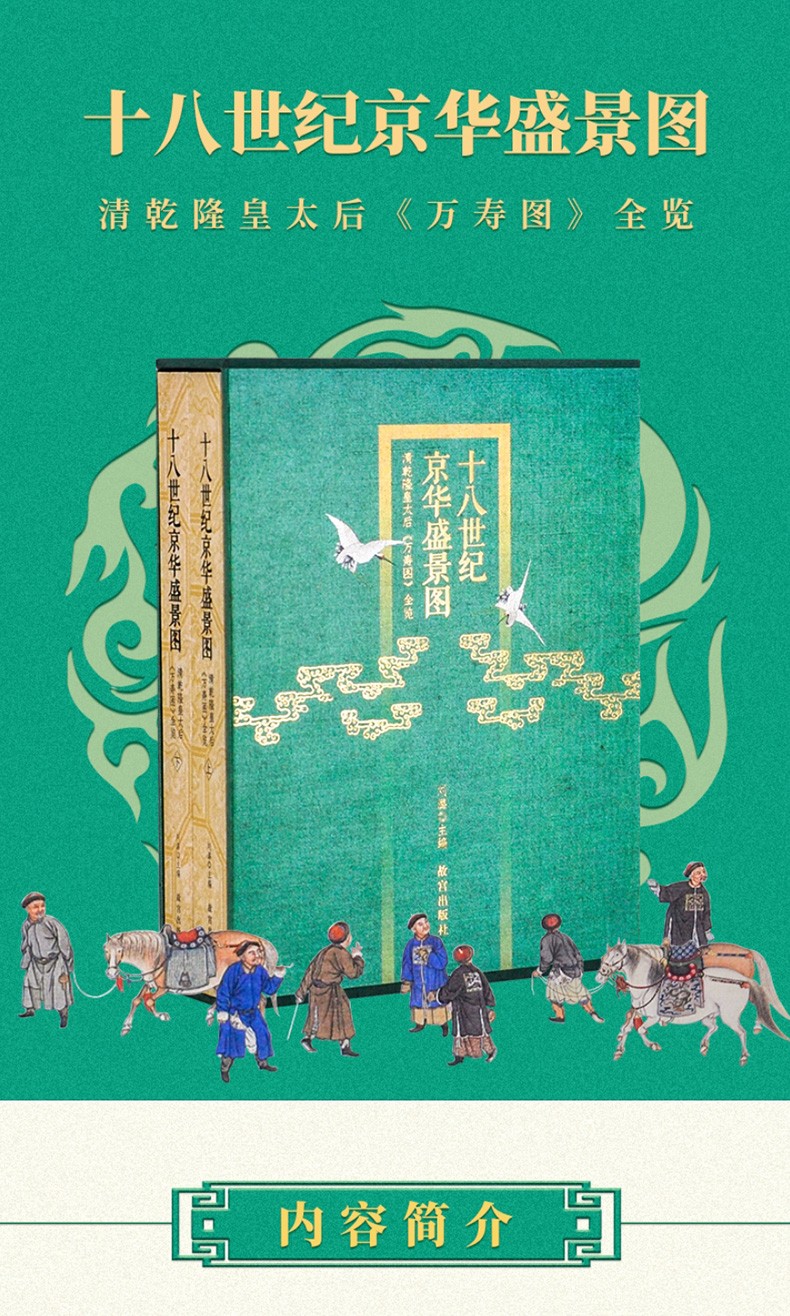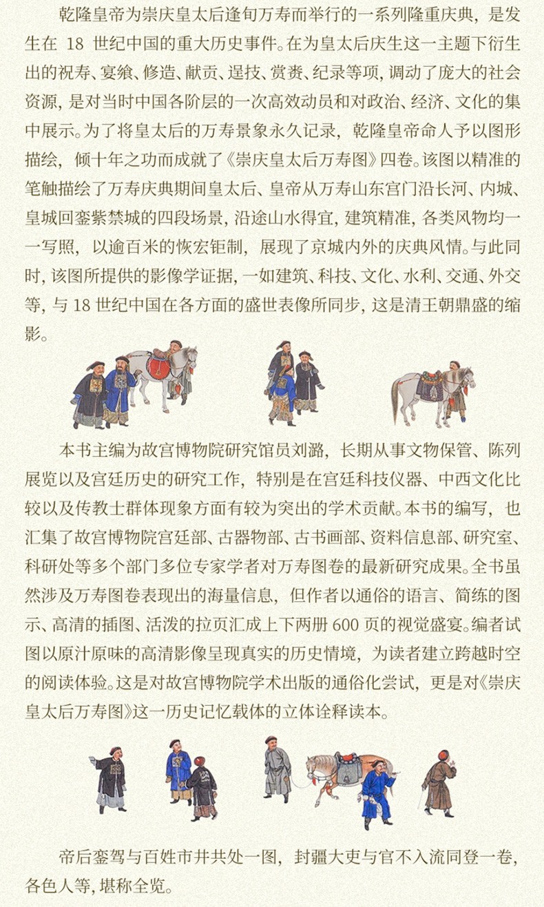 乾隆皇帝為崇慶皇太后逢旬萬壽而舉行的一系列隆重慶典,是發生在18世紀中國的重大歷史事件。 在為皇太后慶生這一主題下衍生出的祝壽、宴饗、修造、獻貢、逞技、賞賚、紀錄等項,調動了龐大的社會資源,是對當時中國各階層的一次高效動員和對政治、經濟、文化的集中展示。 為了將皇太后的萬壽景象永久記錄,乾隆皇帝命人予以圖形描繪,傾十年之功而成就了《崇慶皇太後萬壽圖》四卷。 該圖以精准的筆觸描繪了萬壽慶典期間皇太后、皇帝從萬壽山東宮門沿長河、內城、皇城回鑾紫禁城的四段場景,沿途山水得宜,建築精准,各類風物均一一寫照,以逾百米的恢宏钜制,展現了京城內外的慶典風情。 與此同時,該圖所提供的影像學證據,一如建築、科技、文化、水利、交通、外交等,與18世紀中國在各方面的盛世錶像所同步,這是清王朝鼎盛的縮影。