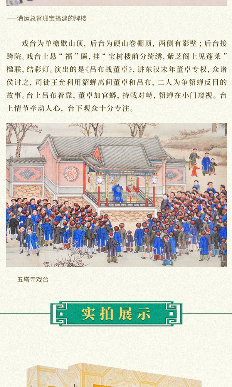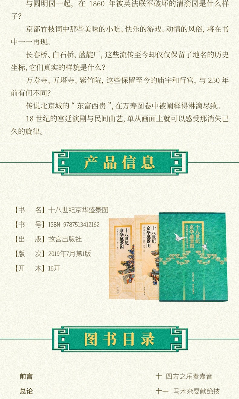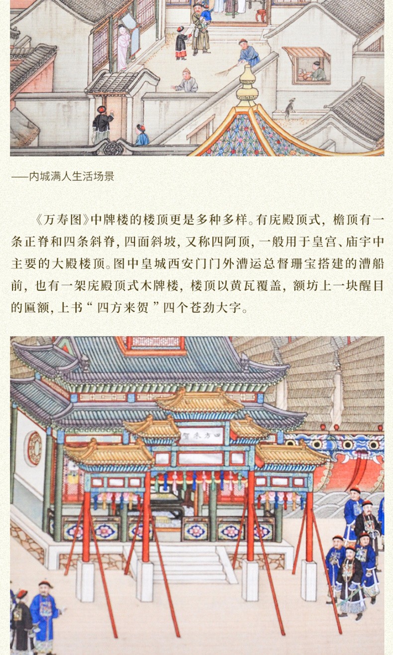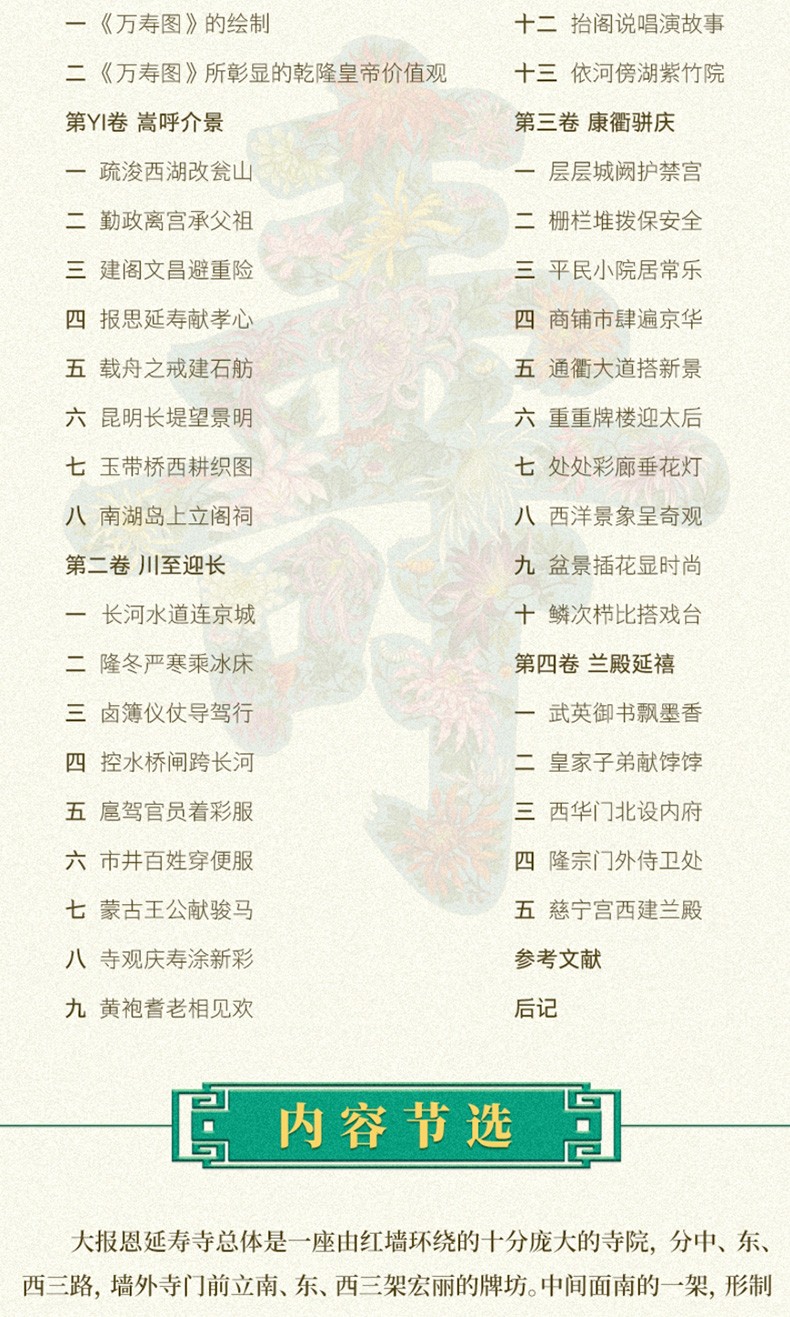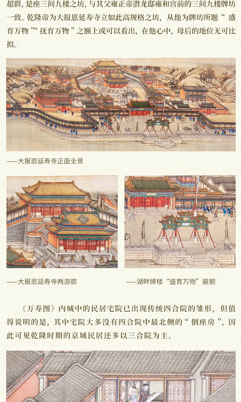 故宮博物院共藏有三套題名為《萬壽圖》的超長卷紀實性繪畫。 第一套是為慶康熙帝六旬萬壽而繪,共兩卷,並由武英殿刊刻了畫面內容相同的《萬壽盛典初集》。 嘉慶二年此圖毀於乾清宮大火,嘉慶年間以《萬壽盛典初集》為藍本重繪,兩卷首尾相加計78.78米。 第二套是以乾隆帝生母崇慶皇太后六旬大慶為題而繪; 第三套是以乾隆帝八旬萬壽為題,共兩卷,首尾相加達134.57米。 本書所研討的是第二套。