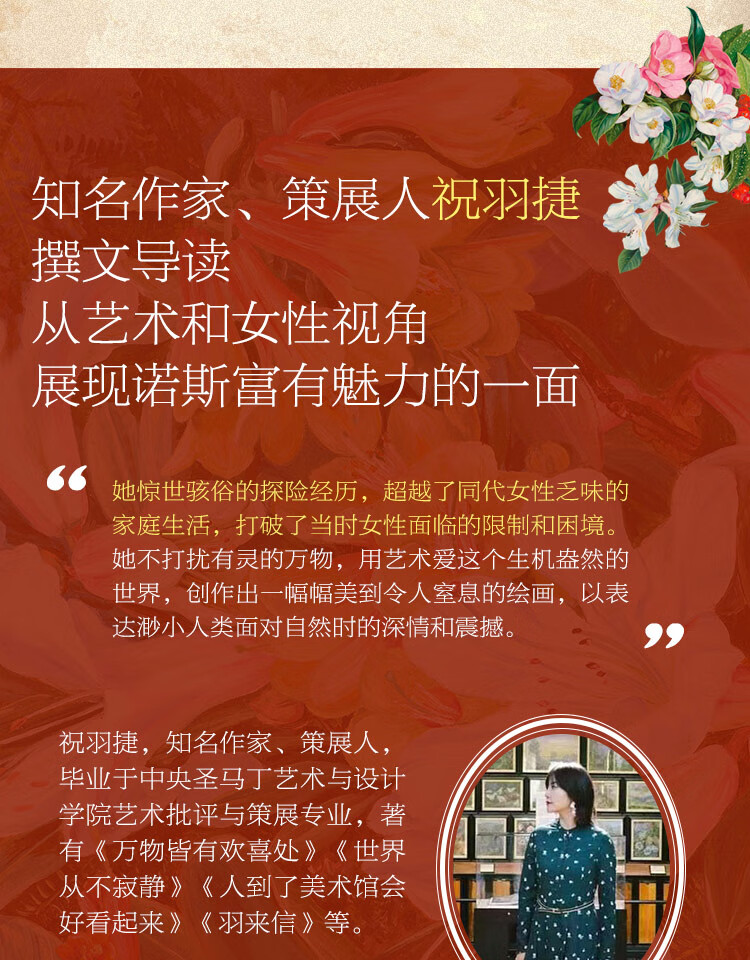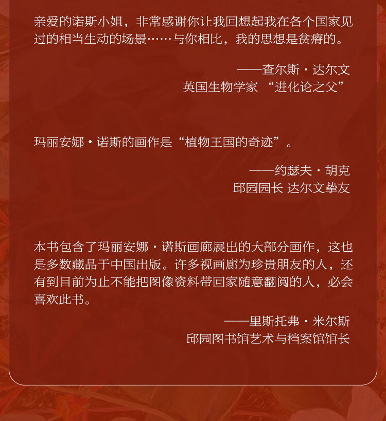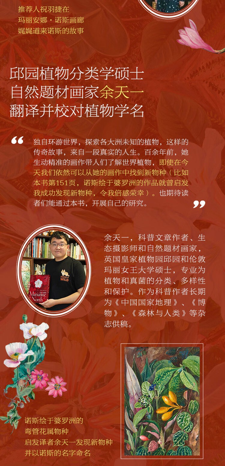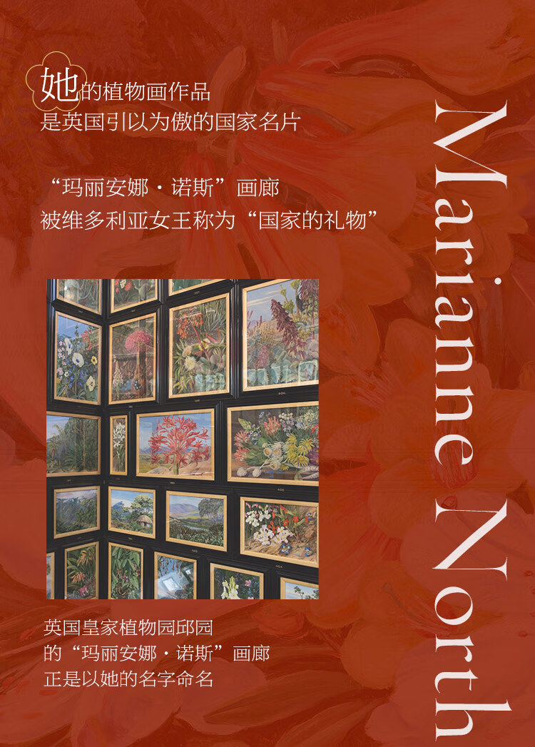 本書為19世紀維多利亞時期偉大的女性植物學家、畫家瑪麗安娜·諾斯(Marianne North)官方畫冊,由英國皇家植物園邱園(Kew Gardens)授權出版,以旅行地區為分類,收錄編選約400幅代表作品,並額外收錄相關目的地和植物知識介紹。瑪麗安娜·諾斯是達爾文的靈感繆斯,同時期的很多科學家都受到過諾斯作品啟發。她有著傳奇的一生,終生未婚、自學畫畫、獨自環遊世界六大洲16國,記錄讓她著迷的熱帶和外來植物,並發現很多新物種。她挑戰維多利亞時代花卉繪畫的傳統,選擇直接在自然環境中繪製植物。這些記錄比彩色攝影發明早了幾年。她試圖用自己的作品,啟發和教育人們了解自然世界。本書由國內女作家、策展人祝羽捷作長文導讀,從藝術和女性視角展現諾斯富有非凡魅力的一面。邱園植物分類學碩士、青年插畫師余天一翻譯並校對植物學名。